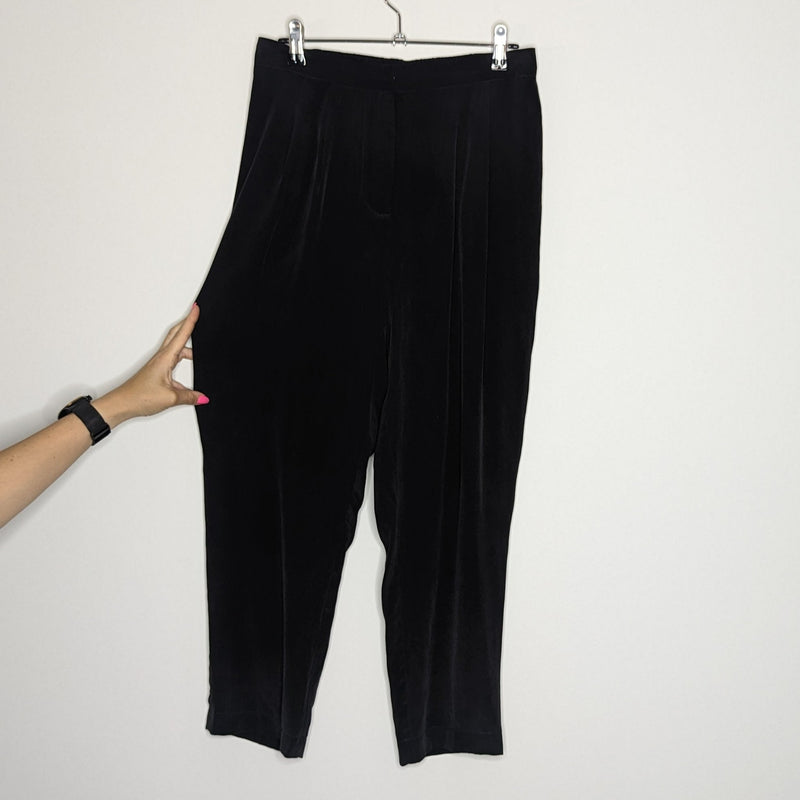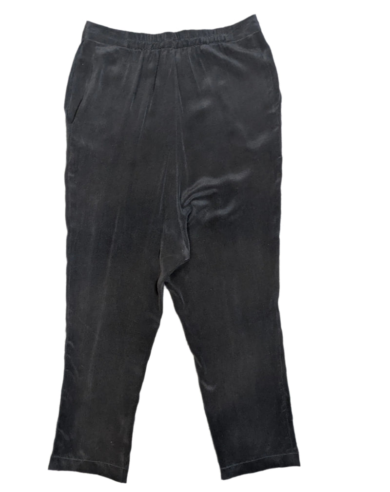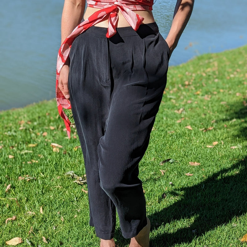 Perfect for office- out-casual, these stunning, relaxed fitting tailored silk pants have soft falling front pleats. Cropped to sit at the ankle, these super soft & comfortable pants have an elasticised waist, allowing a fitting size of 8-10 depending on the wearers size/shape.... alternatively, wear high waisted due to the lower crotch & relaxed style.