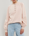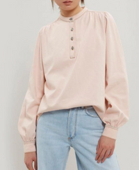 Baby pink denim shirt from Copenhagen-based fashion label, Ganni. Crafted from soft cotton denim, the ‘Trinity’ is as versatile yet distinct as you'd expect, pairing a pastel hue with a high neck and puff shoulders.