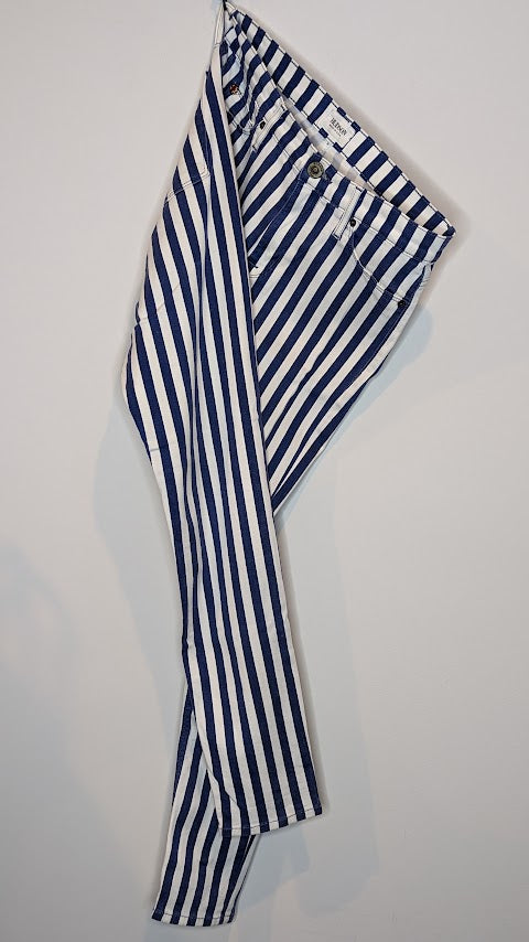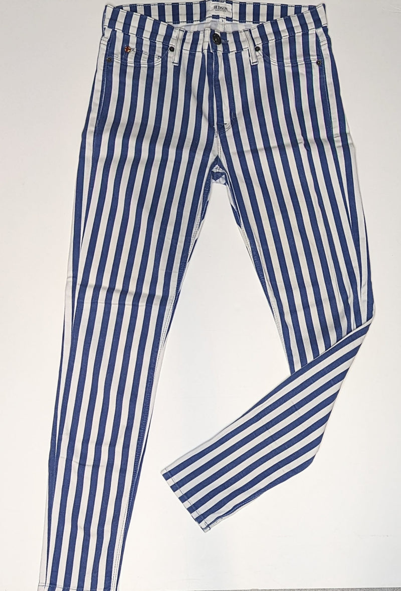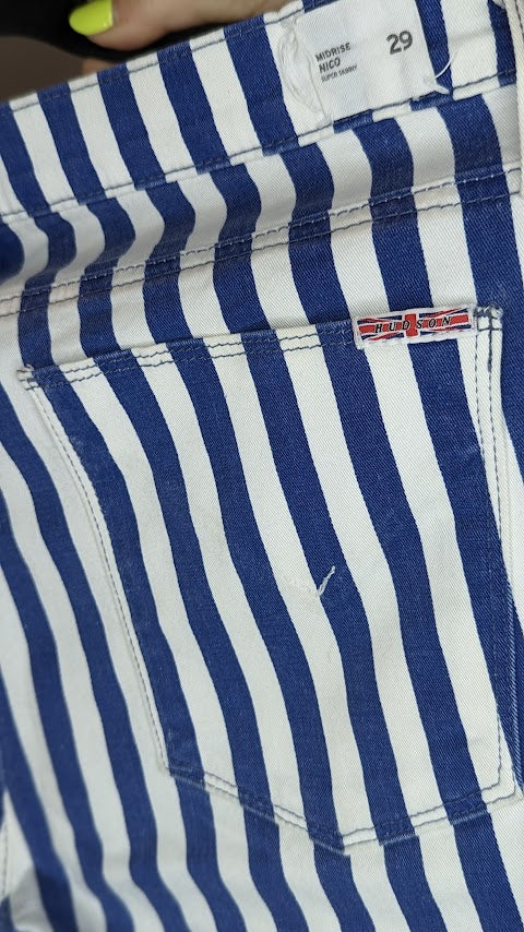 Step out in style and make a statement with these Hudson Nico Mid Rise Super Skinny Jeans. The navy and white ladder stripes will have you standing out with a bold, risk-taking look. Show off your unique style with the perfect fit, stretchy fabric &comfortable construction. Dare to be daring!