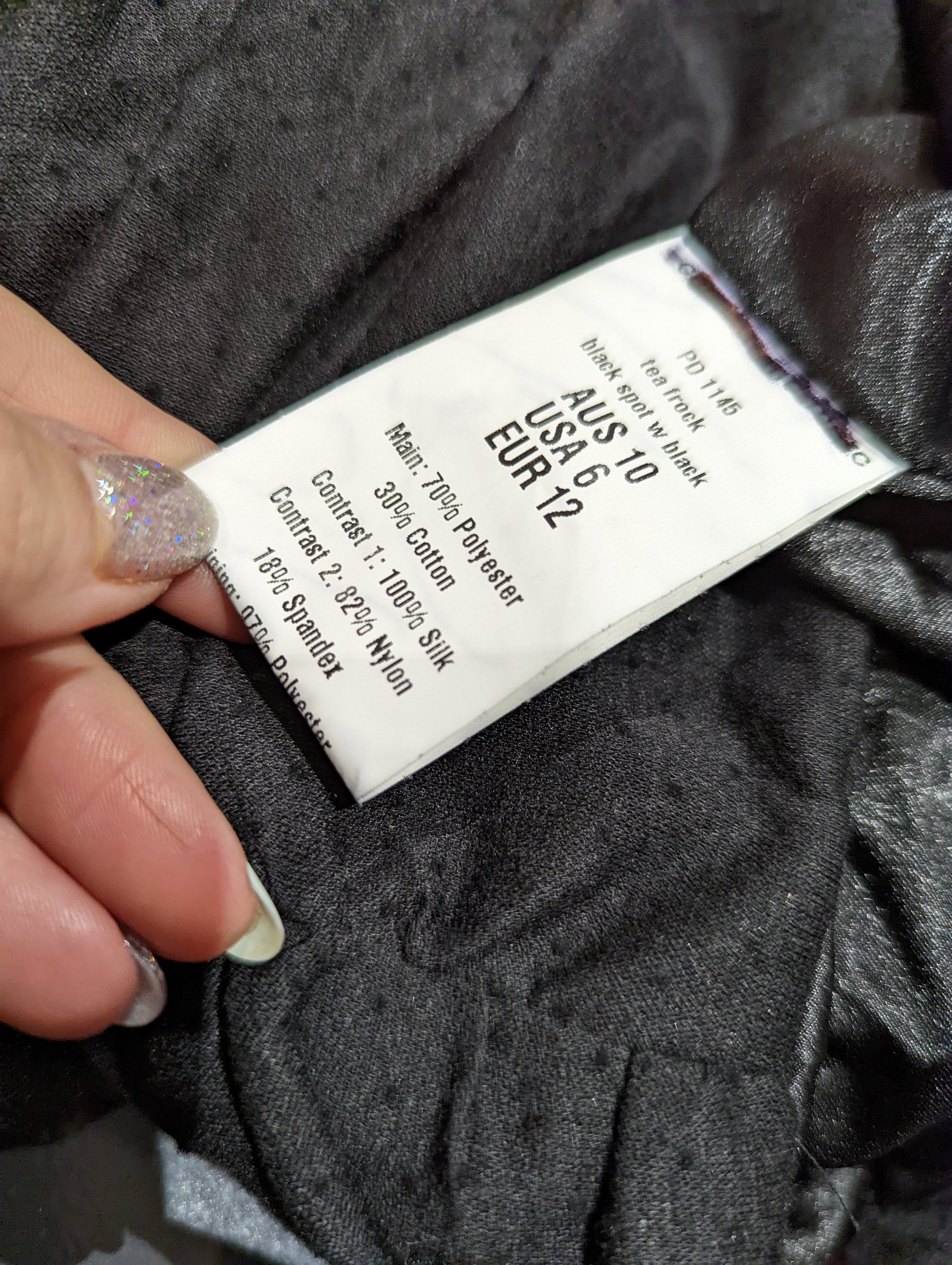 - 70% polyester, 30% cotton; contrast 1 100% silk; Contrast 2 82% nylon; 18% spandex