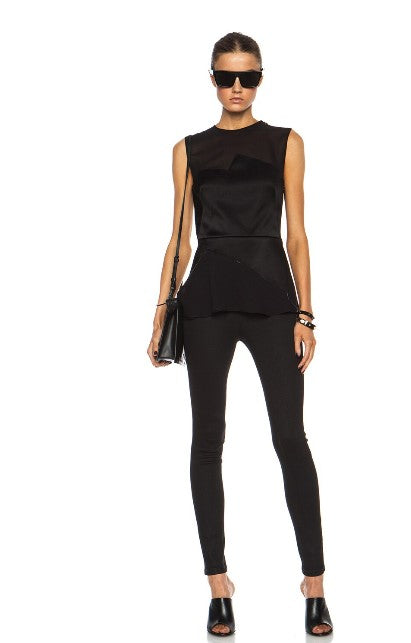 3.1 Phillip Lim Luna Acetate-Blend Top With Chiffon Yoke's structured sleeveless top in black is a dramatic top... with its daring sheer panels & a flowy peplum hem it exudes edgy sophistication.