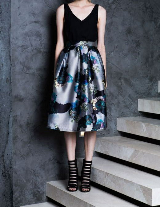 Garden Party Floral Full Skirt Luxe satin pleated skirt, flared design to flatter the figure. Bold floral print all over