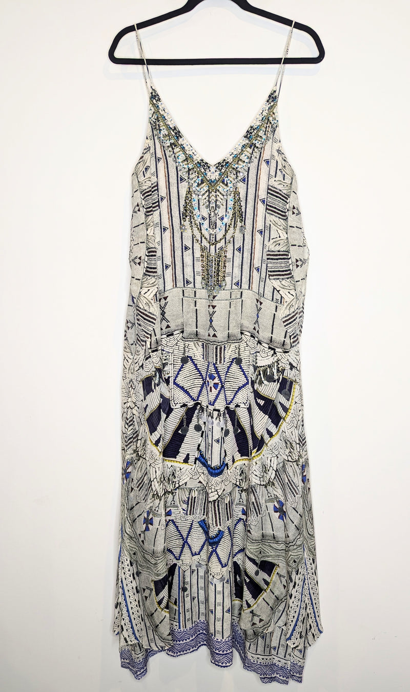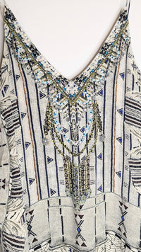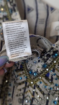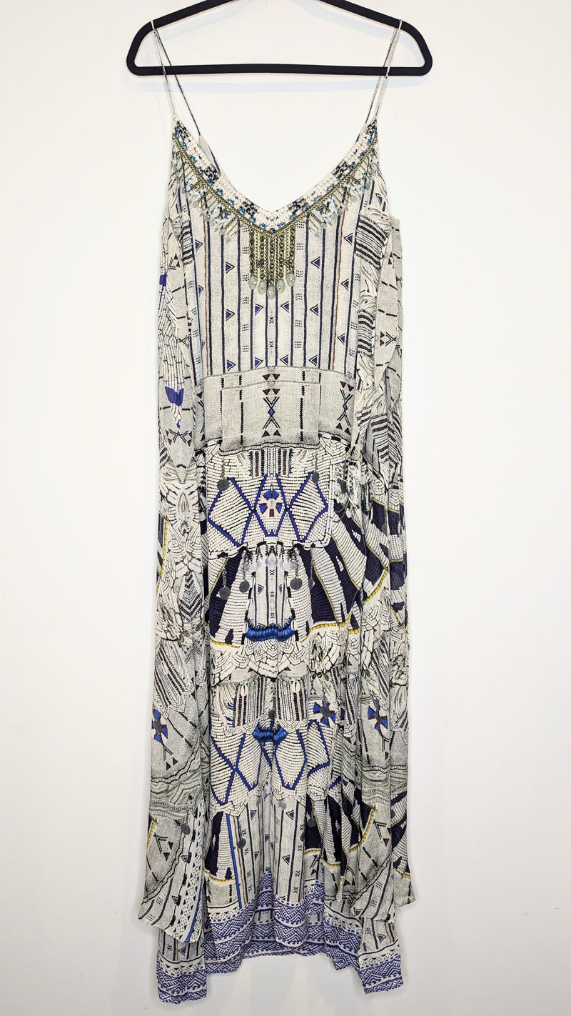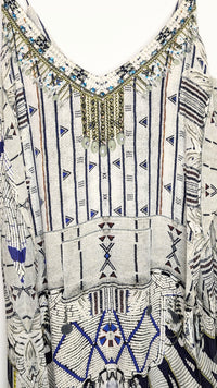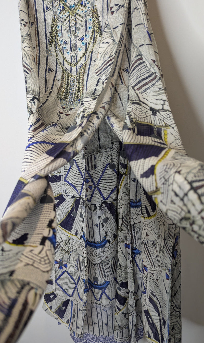 Bring a sense of mystical intrigue to your wardrobe with this beautiful floor length layered dress. This striking piece features a billowing silk folds with added layers that create an uninhibited dimension and movement. The expertly hand-applied coloured crystals on the neckline bring a touch of luxurious artisanal appeal to the look.