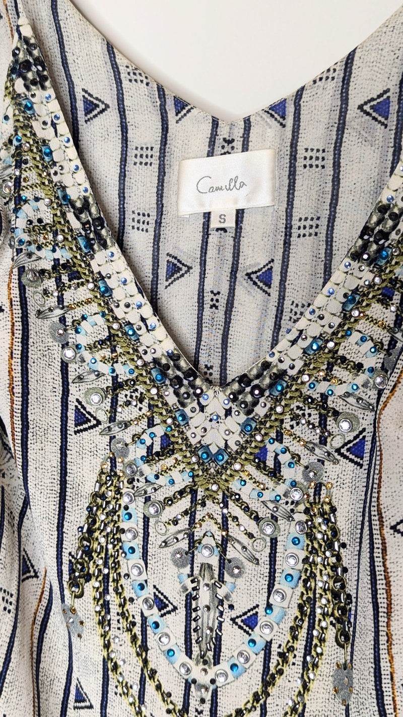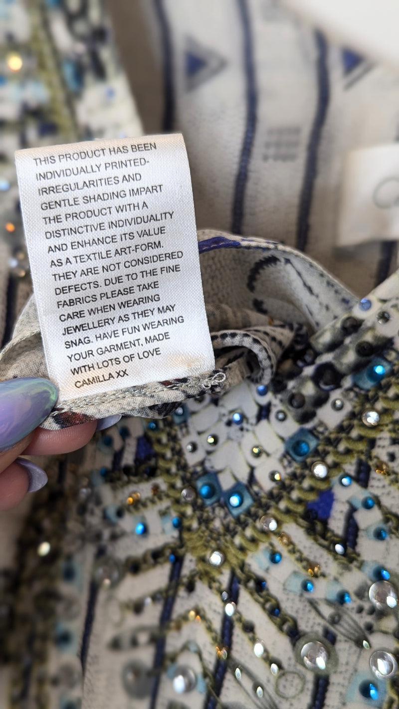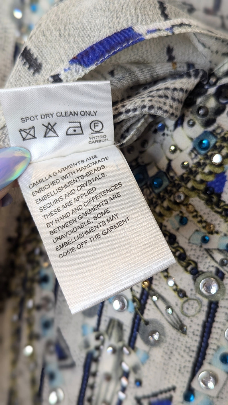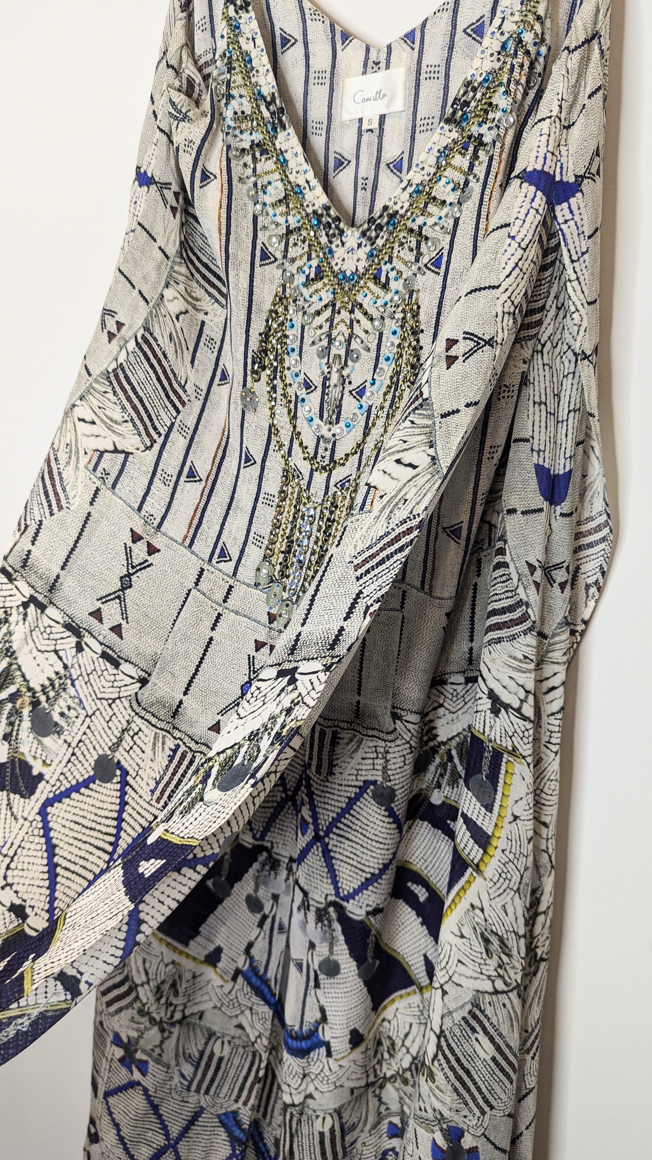 Bring a sense of mystical intrigue to your wardrobe with this beautiful floor length layered dress. This striking piece features a billowing silk folds with added layers that create an uninhibited dimension and movement. The expertly hand-applied coloured crystals on the neckline bring a touch of luxurious artisanal appeal to the look.