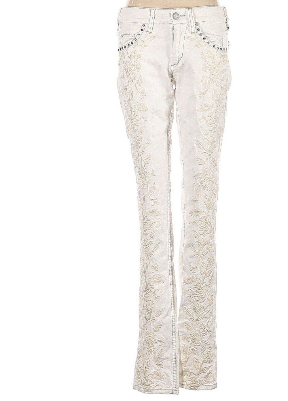Featuring snaking cream embroidery and studded pockets for a little extra detail. A chic upgrade from your basic pair of white jeans - a little extravagance!
