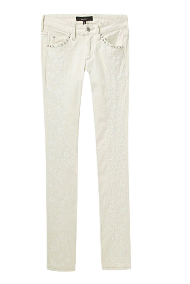 "From Parisian designer Isabel Marant, pairing French effortlessness with bohemian versatility; a classic skinny jean with 5-pocket styling, stud accents & tonal embroidery." - lagarconne.com