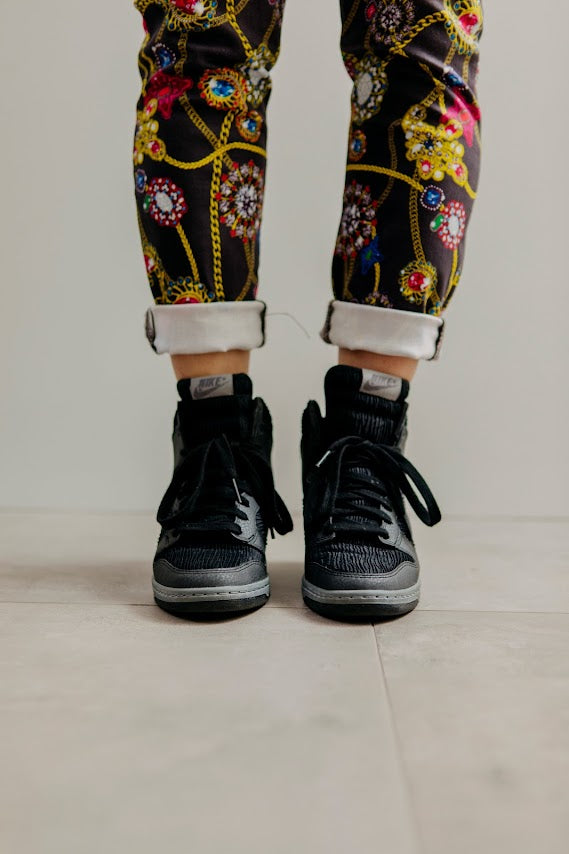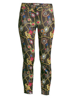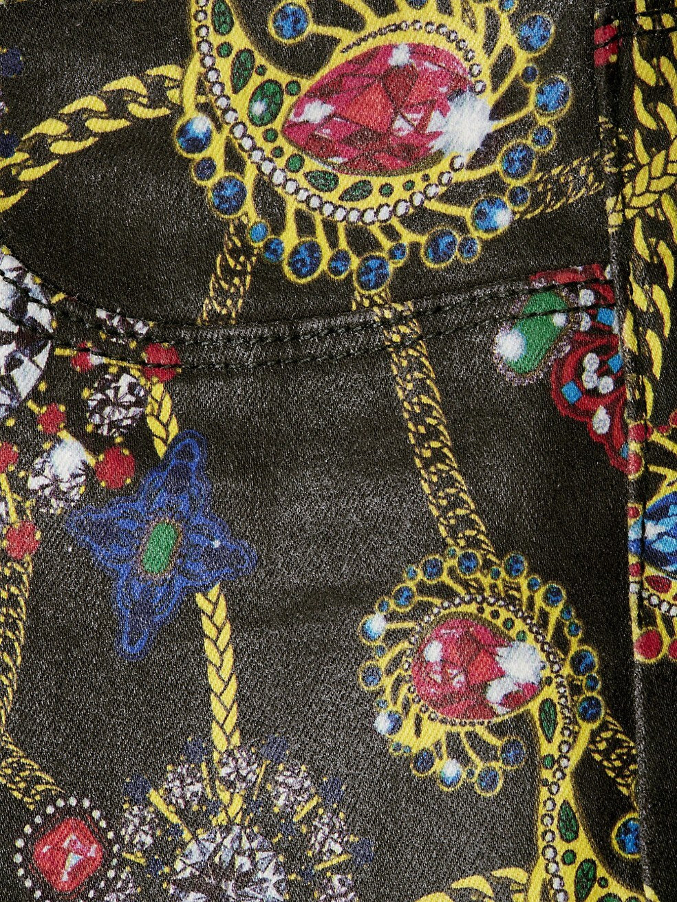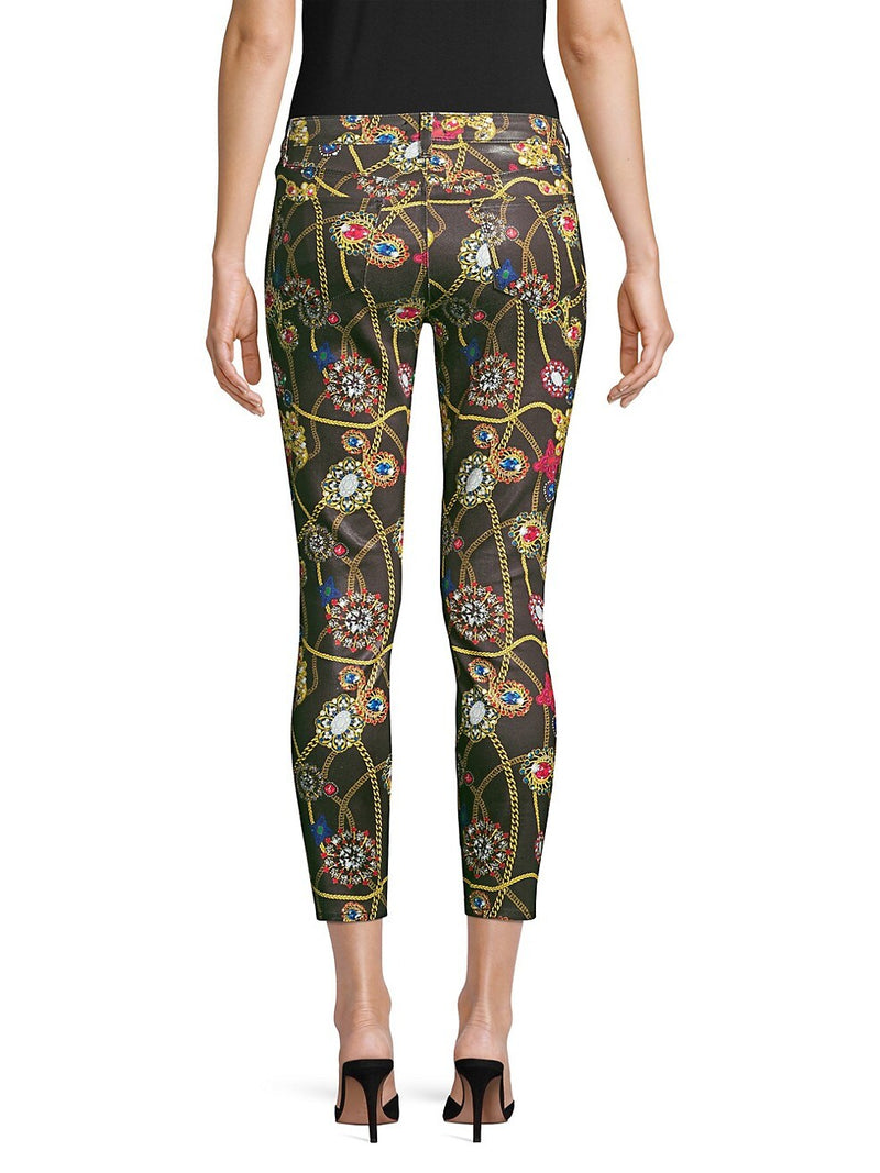Once sold at Sacks Fifth Avenue, L’AGENCE's ultra funky Margot high-rise skinny jean is a coated premium stretch denim & bold colourful jewel/jewellery print. Contoured waistband and tapered leg hug from waist to ankle to define & slim the silhouette. High-recovery denim holds its shape, smoothing the figure without sacrificing comfort.