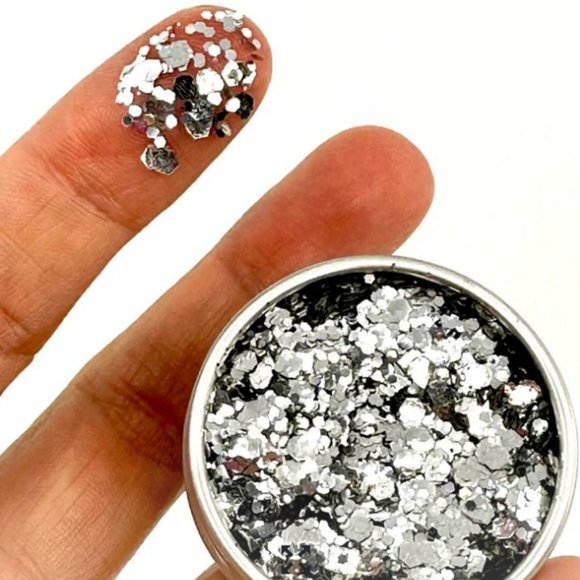 The metallic soft luster of three silver glitter sizes will bring out your inter techno sheen and robot radiance. This sleek biodegradable glitter is a party makeup must have. Can also be used on kids & in crafts